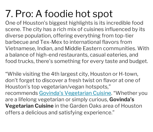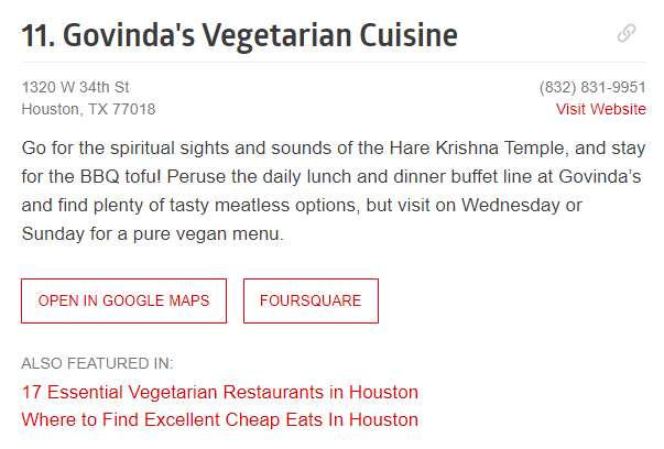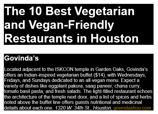 Housed in the Hare Krishna Temple & Cultural Center, the Indian buffet and salad bar at Govinda’s is chock-full of vegetarian and vegan edibles like seed sprouts and cream of veg soup. Their spiced broth pairs well with a side of greens tossed in a vegan almond dressing that puts ranch to shame. https://houston.eater.com/maps/houston-vegan-best-vegetarian-restaurants
